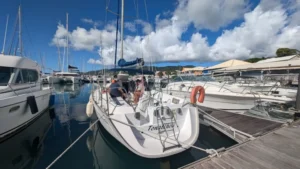 Amarré à la Marina du Marin, vous pourrez, à chaque sortie, en cours collectif ou particulier, vous exercer aux manoeuvres de port et à la circulation dans un chenal.