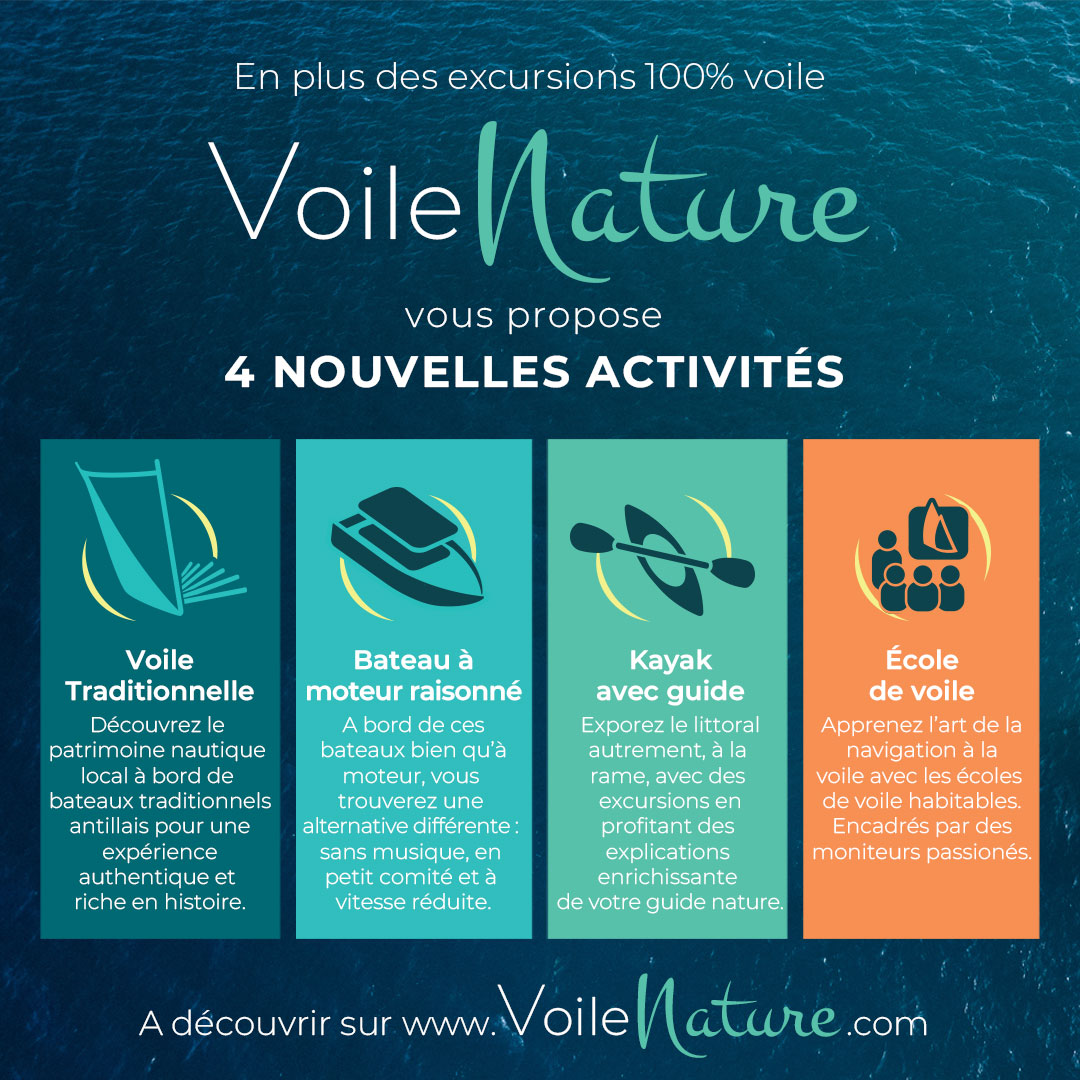 Depuis 2024, en plus des balades à la voile, de nouvelles activités nautiques ont rejoint Voile Nature pour toujours mieux découvrir et redécouvrir la Martinique et la Guadeloupe dans une optique de slow tourisme :